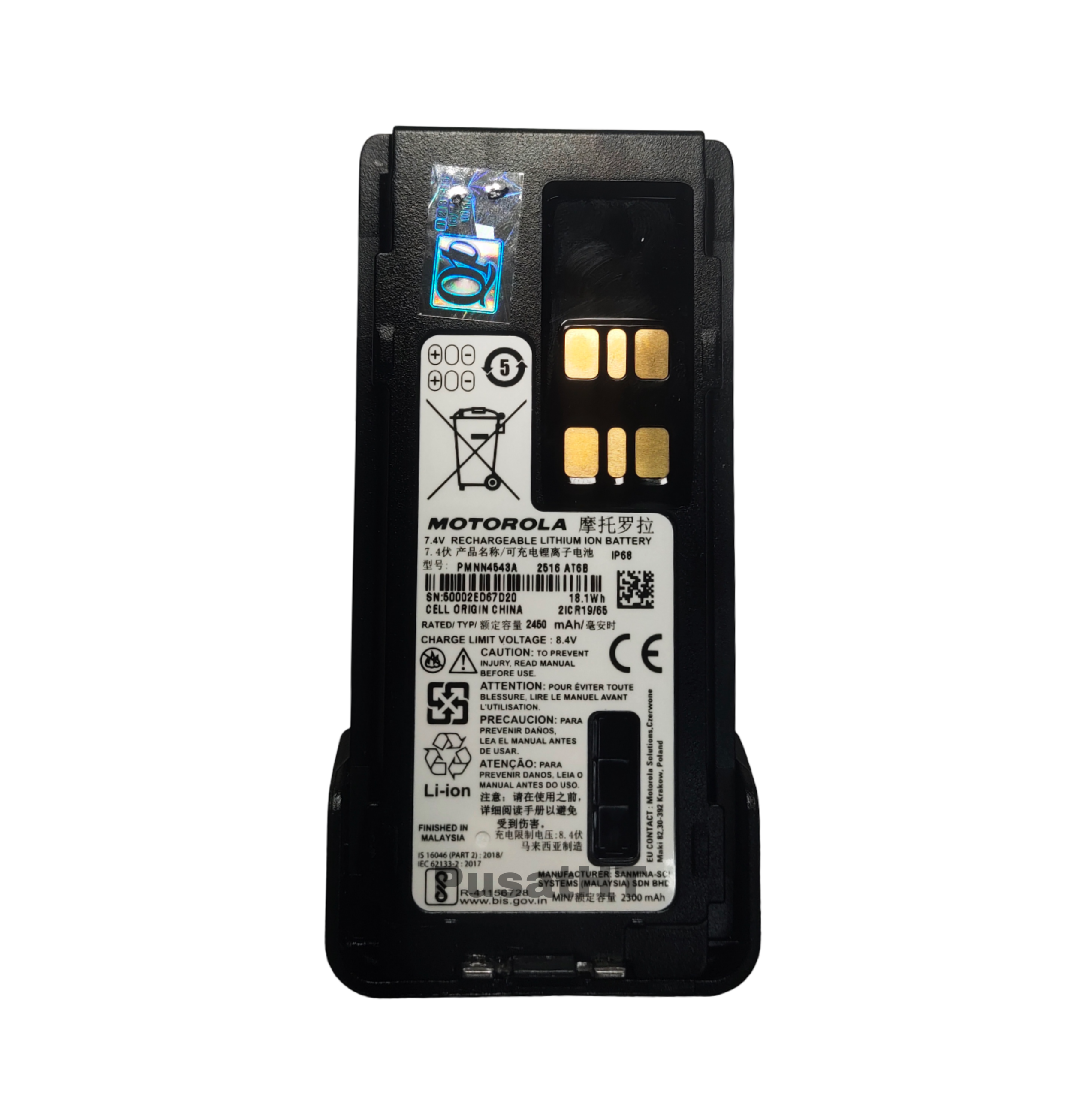 Motorola PMNN4543A – Baterai berguna talky dengan tipe baterai Lithium (Li-ion), kapasitas 2450 mAh, tegangan 8,4 volt, tahan air dengan IP Rating IP68. Motorola PMNN4543A adalah baterai handy talky dengan tipe Li-ion (lithium ion) khusus untuk mendukung performa radio HT Motorola seri XiR. Dengan kapasitas tipikal sebesar 2450 mAh, baterai ini dapat digunakan cocok untuk penggunaan jangka panjang. Baterai HT Motorola ini juga dibuat dengan rating IP68 yang tahan debu sepenuhnya dan dapat bertahan di dalam air hingga kedalaman tertentu dalam jangka waktu tertentu.